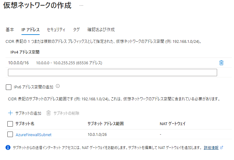 サブネット名のdefaultをクリックし、名前をAzureFirewallSubnetに変更します。