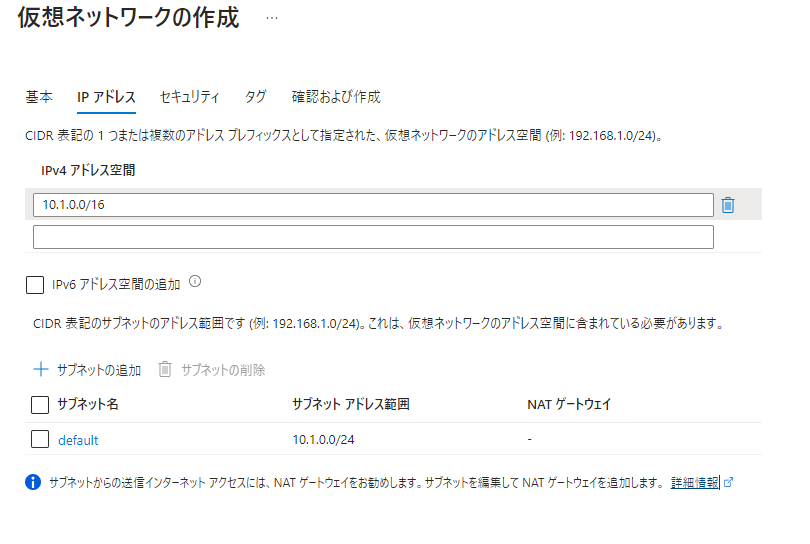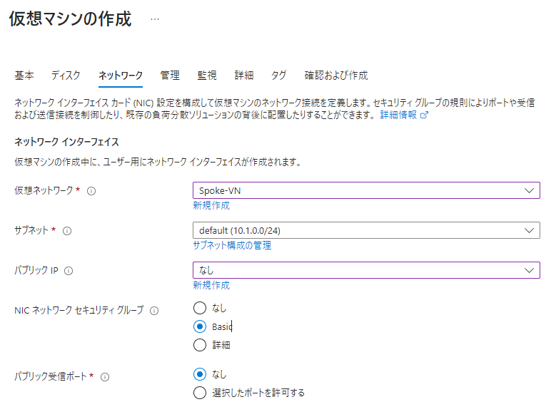 サブネット:default パブリックIP:なし NICネットワークセキュリティグループ:Basic |