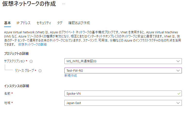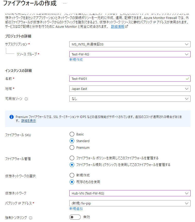名前:Test-FW01 地域:Japan East 可用性ゾーン:なし ファイアウォールSKU:Standard ファイアウォール管理:ファイアウォール規則(クラシック)を使用してこのファイアウォールを管理する 仮想ネットワークの選択:既存のものを使用 仮想ネットワーク:Hub-VN(Test-FW-RG) パブリックIPアドレス:fw-pip(新規作成) 強制トンネリング:無効 |