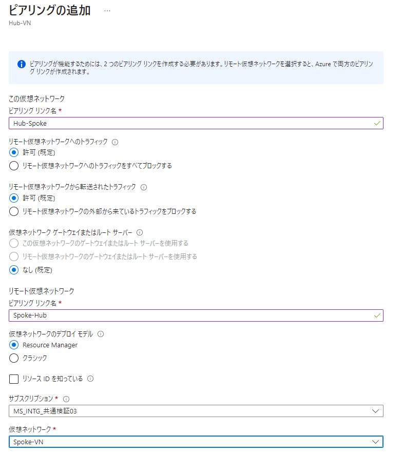 作成したHubとSpokeの仮想ネットワークはデフォルトだと接続されておらず疎通できません。