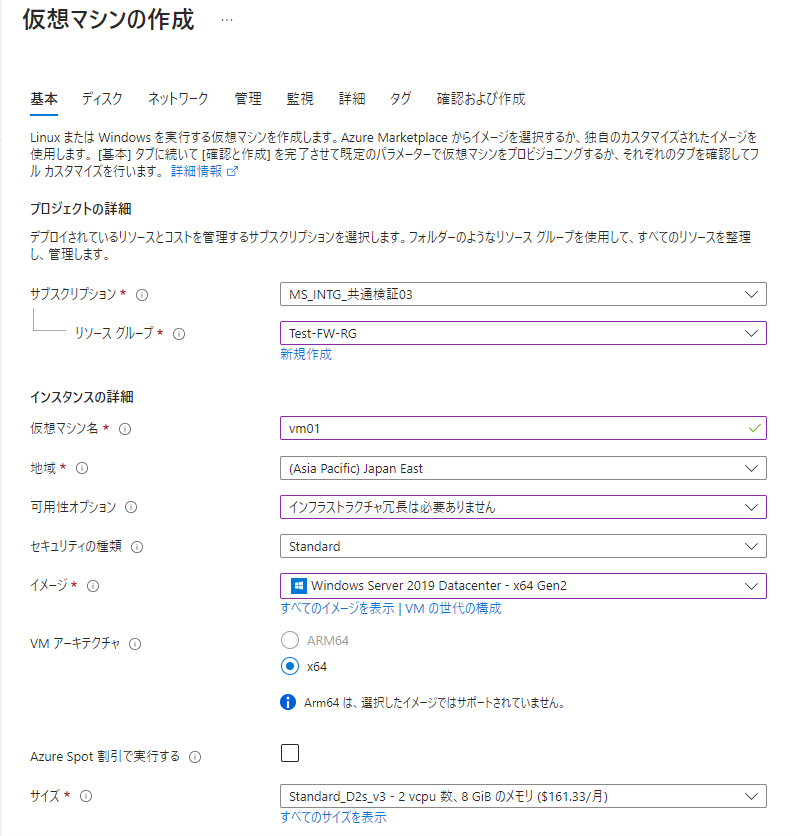 仮想マシン名:vm01 地域:Japan East 可用性オプション:なし セキュリティの種類:Standard イメージ:Windows Server 2019 Datacenter – x64 Gen2 VMアーキテクチャ:x64 サイズ:Standard_D2s_v3 パブリック受信ポート:なし |