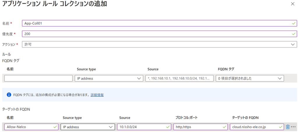優先度:200 アクション:許可 ターゲットのFQDN 名前:Allow-Nelco Source type:IP address Source:10.1.0.0/24 プロトコルポート:http,https ターゲットのFQDN:cloud.nissho-ele.co.jp |