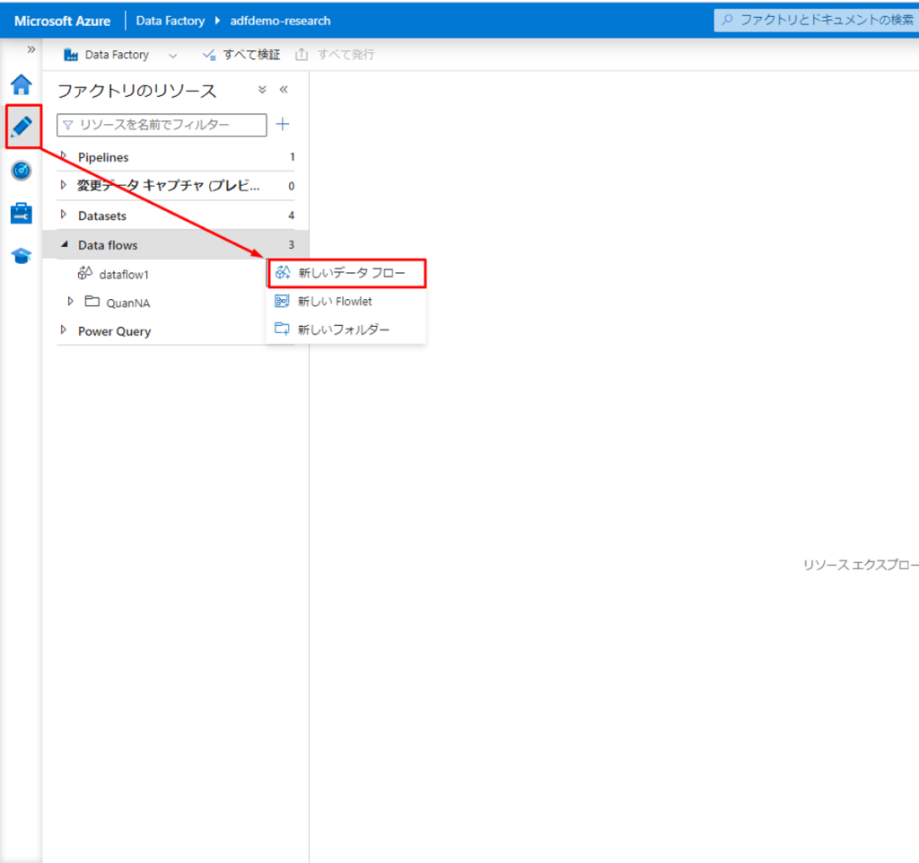 アイコンをクリックして、「新しいデータフロー」をクリックします。