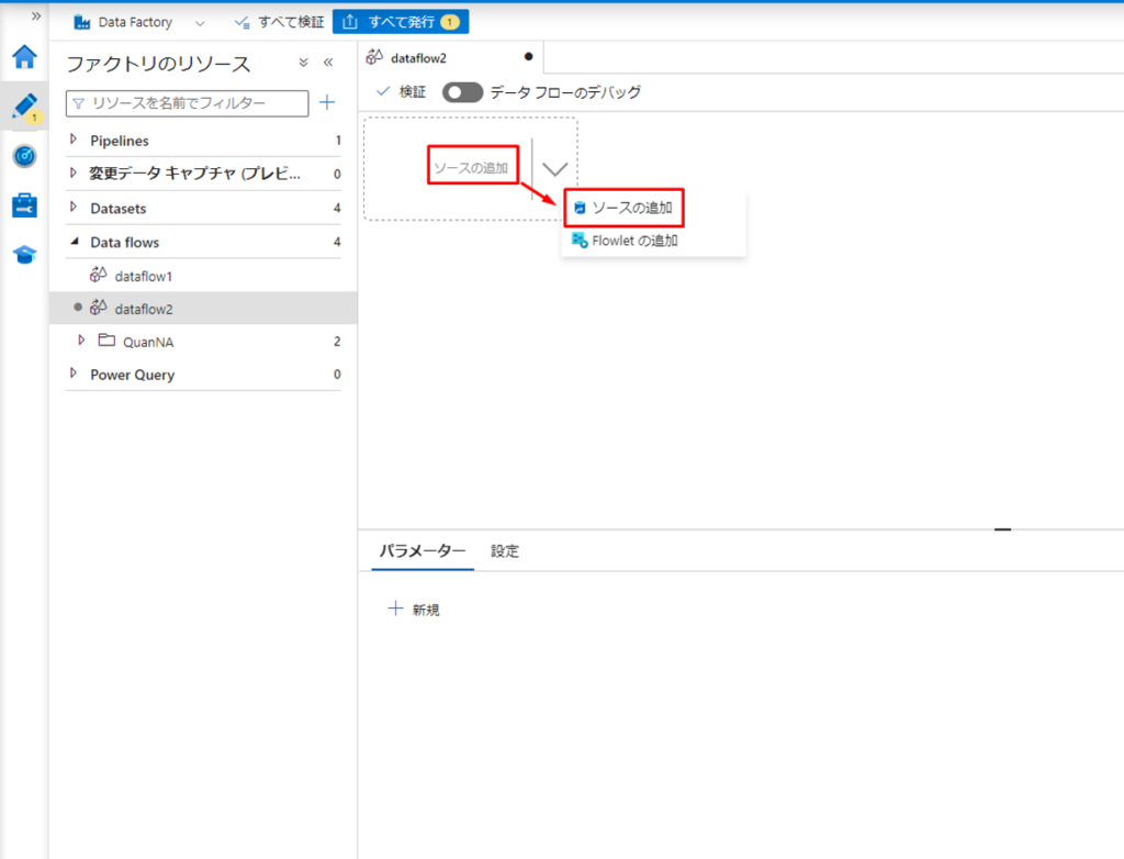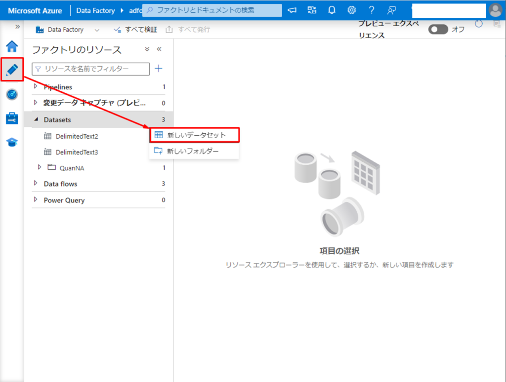 ① Azure Data Factoryのポータル画面で