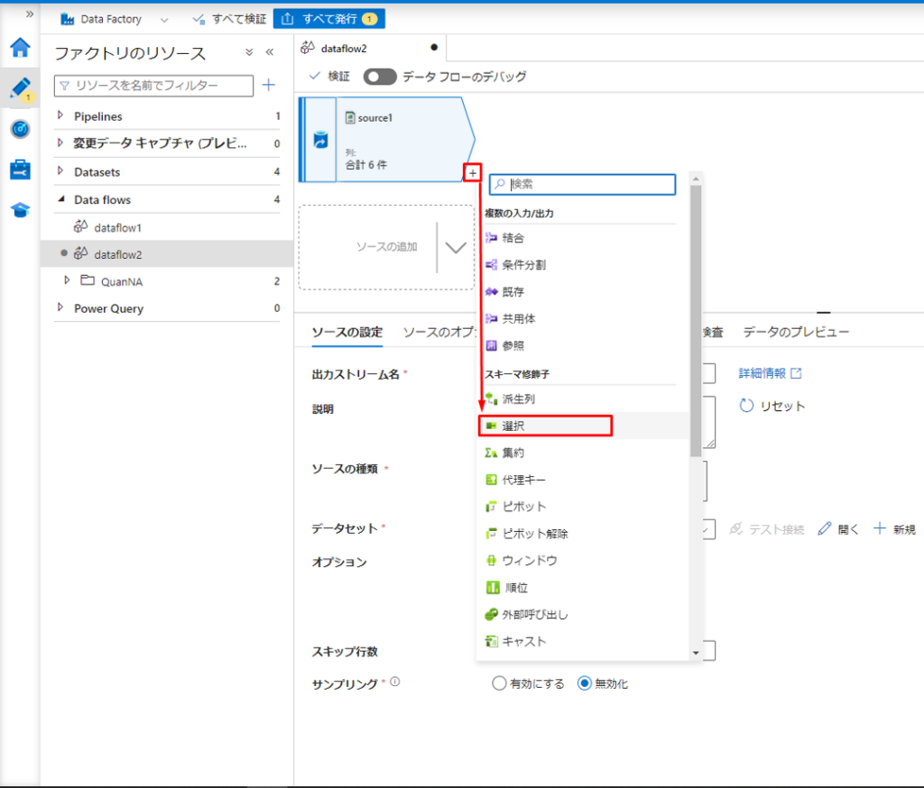Azure Data Factoryでインラインビュー、サブクエリーを実現するために、1つのデータセットの作成が必要です。