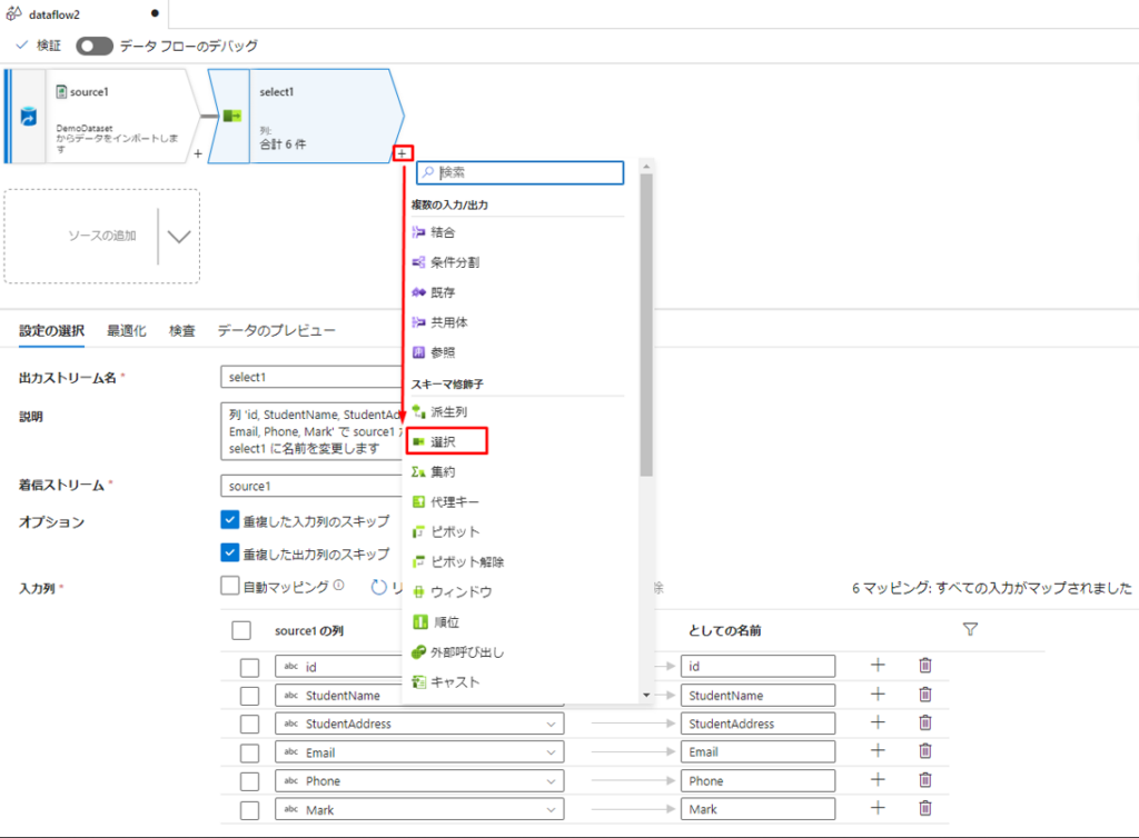 ⑭ IDとStudentNameを取得するには、選択アクションを作成します。