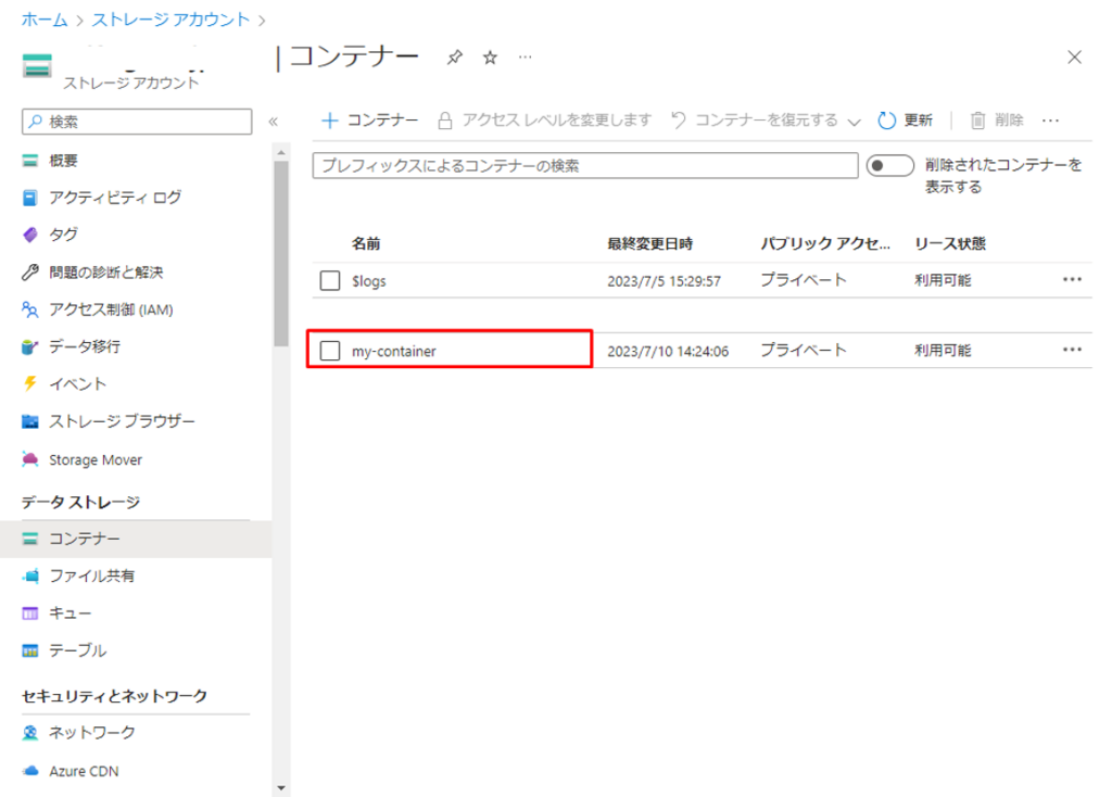 ④ コンテナーの一覧が表示されます。作成したコンテナーをクリックします。
