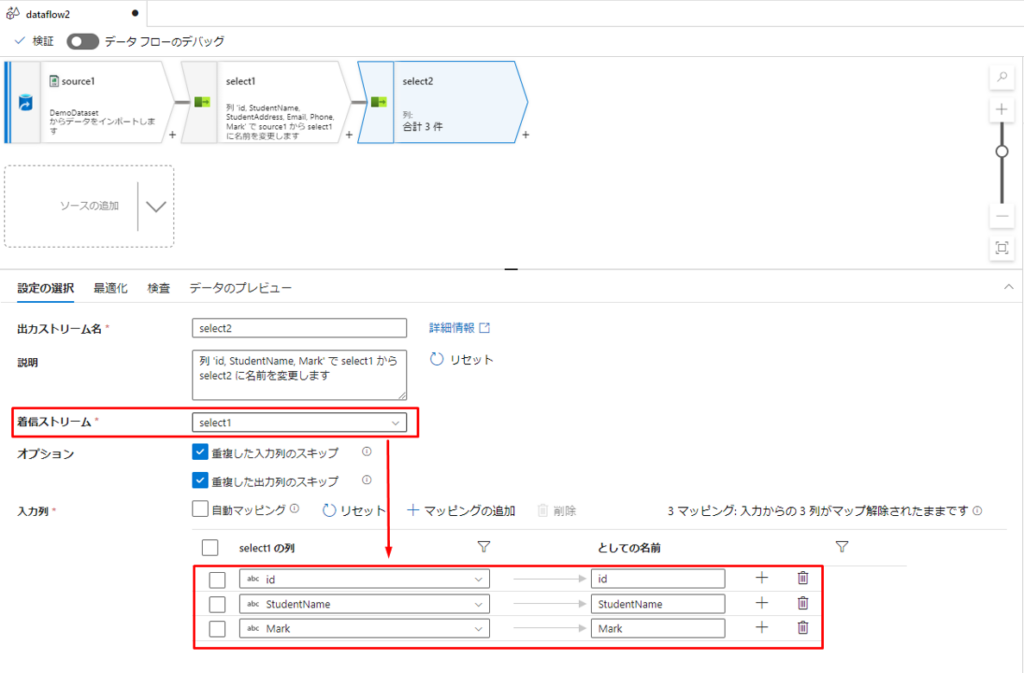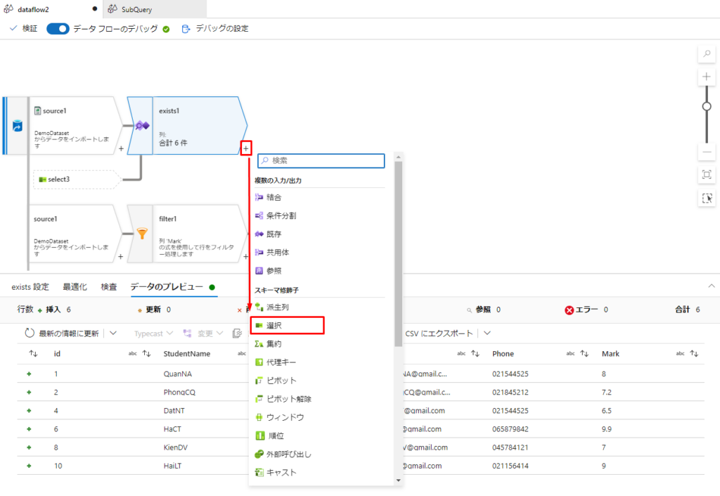 次に、2つ目の選択アクションを作成して、作成したインラインビューからID、StudentName、Mark の3つフィールドを取得します。