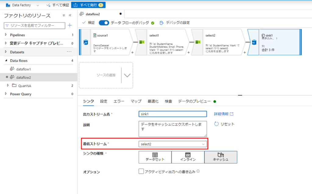 ⑪ ADFでインラインビューの実現が完了しました。実現後、シンクで変換したデータを保存します。