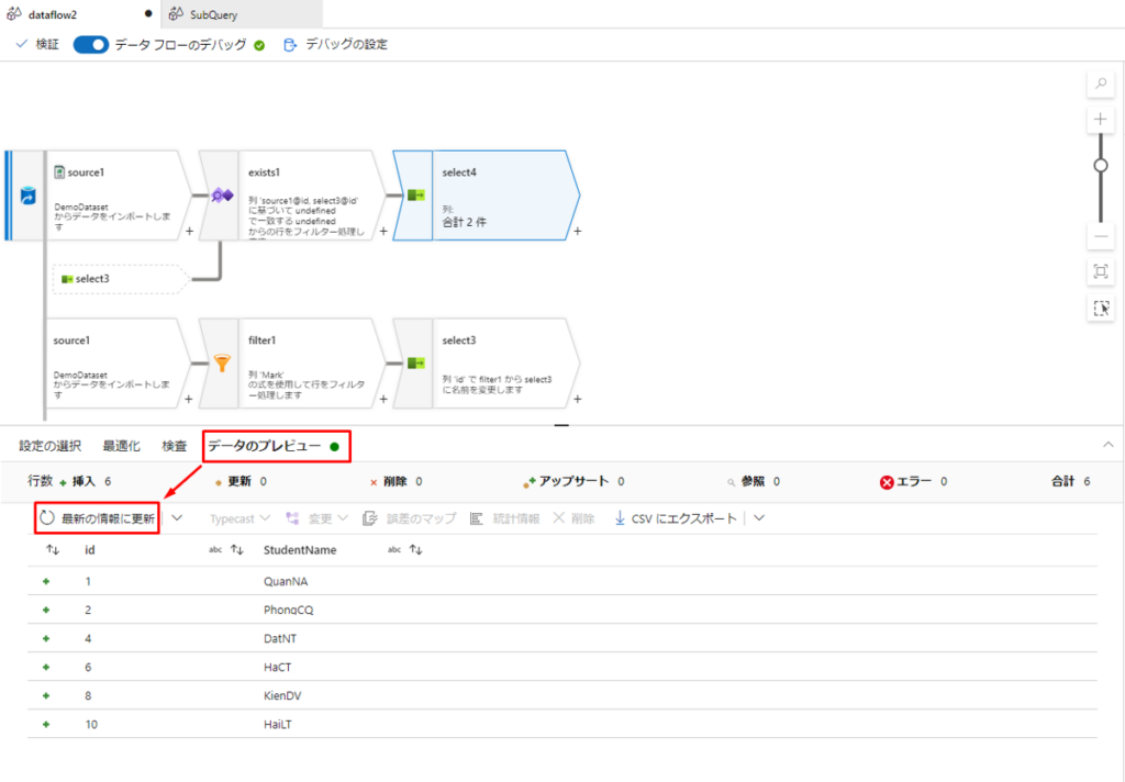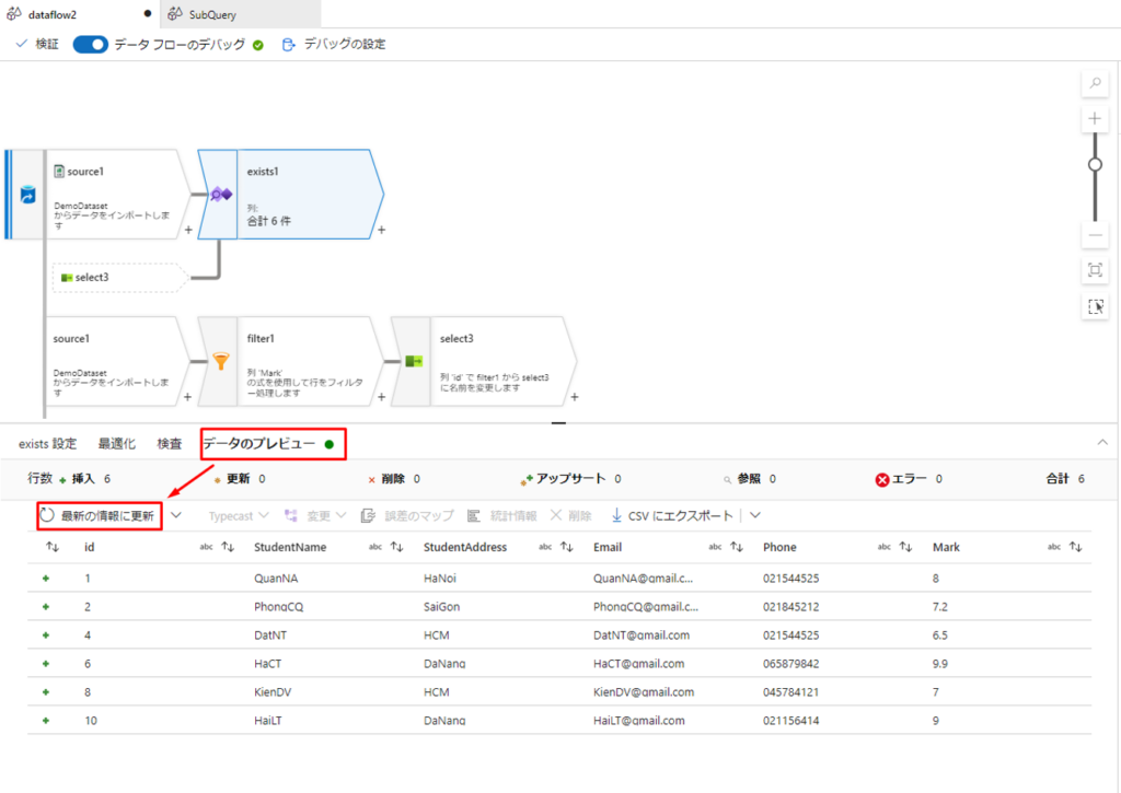 ⑱「データのプレビュー」をクリックして「最新の情報に更新」を選択すると、 「mark > 5」での StudentのIDとStudentName が表示されます。