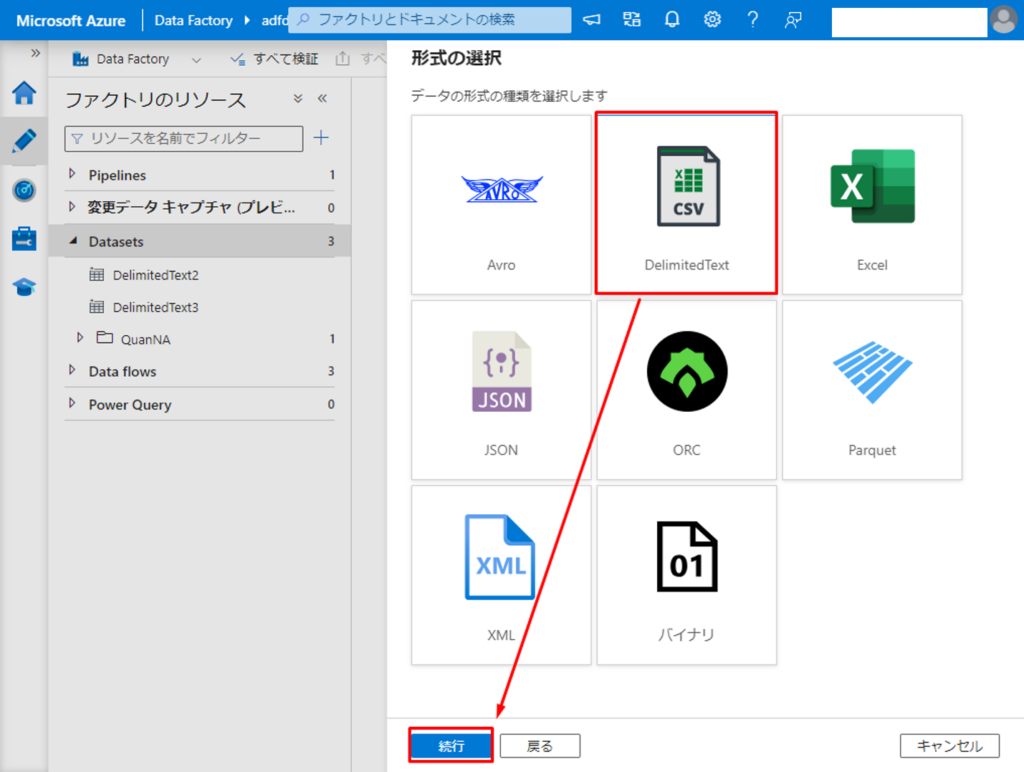 ③「DelimitedText」を選択して、「続行」をクリックします。