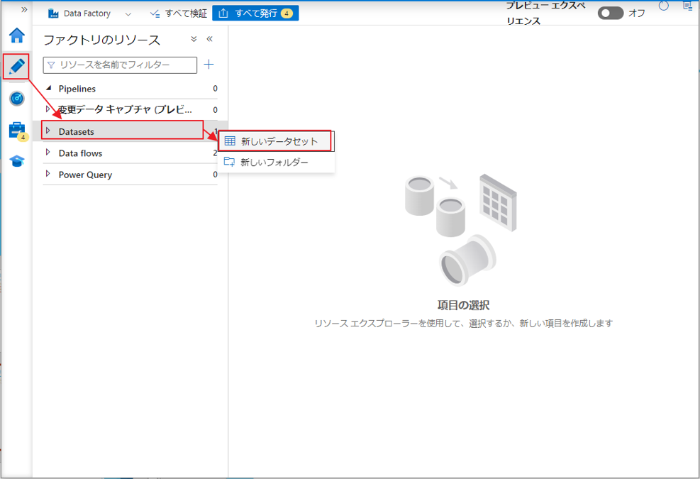 ① サイドバーで「Author」をクリックして、次に「Data flows」をクリックして、「新しいデータセット」を選択します。