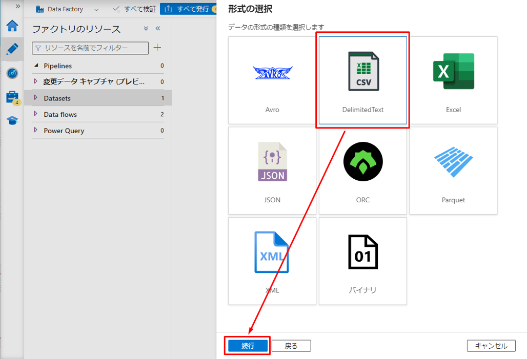 ④「DelimitedText」を選択して「実行」ボタンをクリックします。