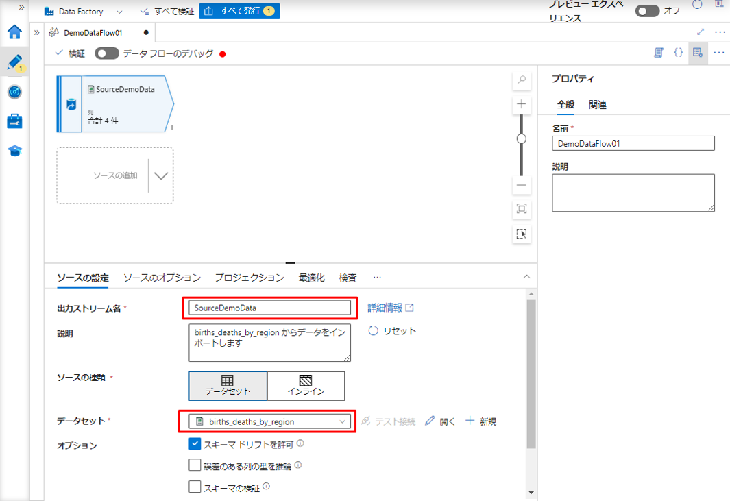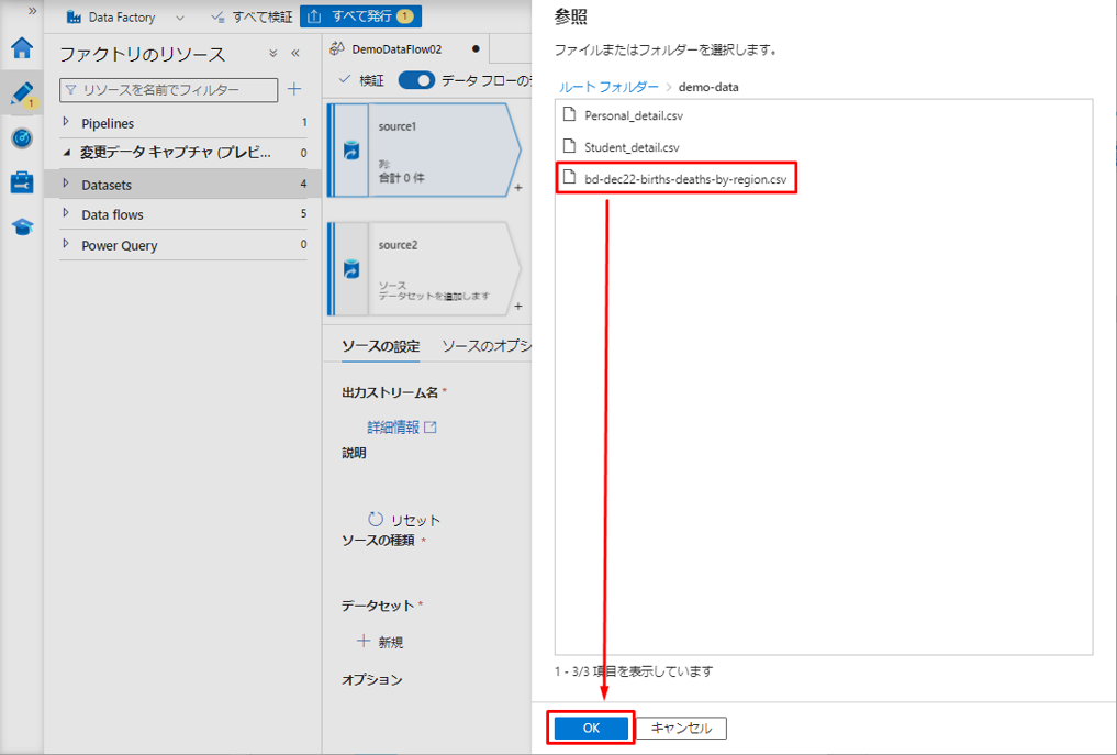 ⑤「ソースの設定」タブで、データフロー名を変更して、ストレージアカウントでアップロードしたデータセットを選択します。