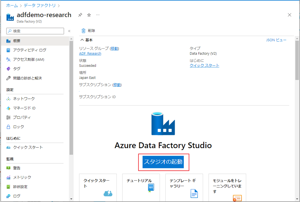 ① Azure Data Factory 画面で「スタジオの起動」をクリックしてワークスペースを起動します。