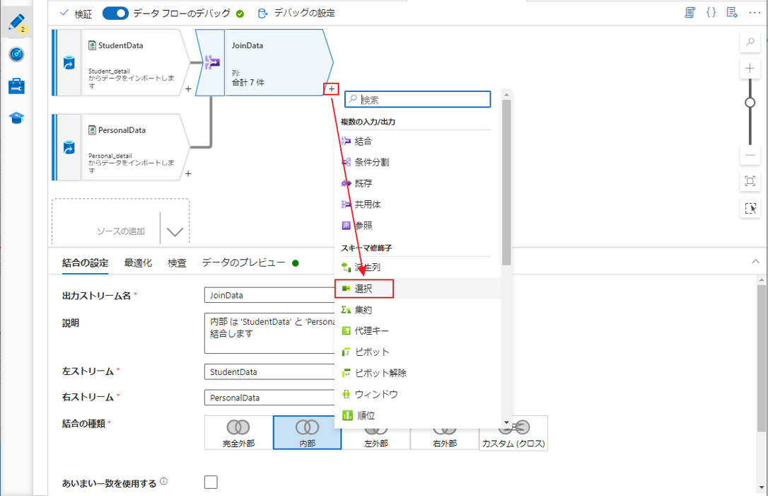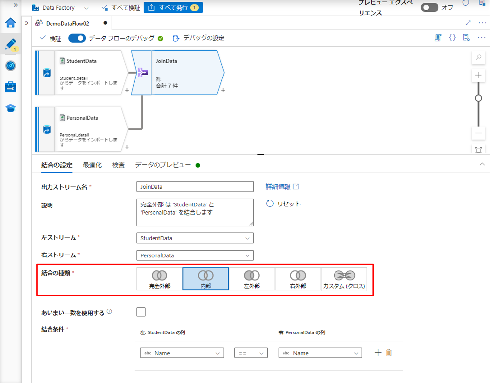 SQL の JOIN結合のように、結合の列を元に2つ以上のテーブルを結合するには、ADF で結合変換を使用します。