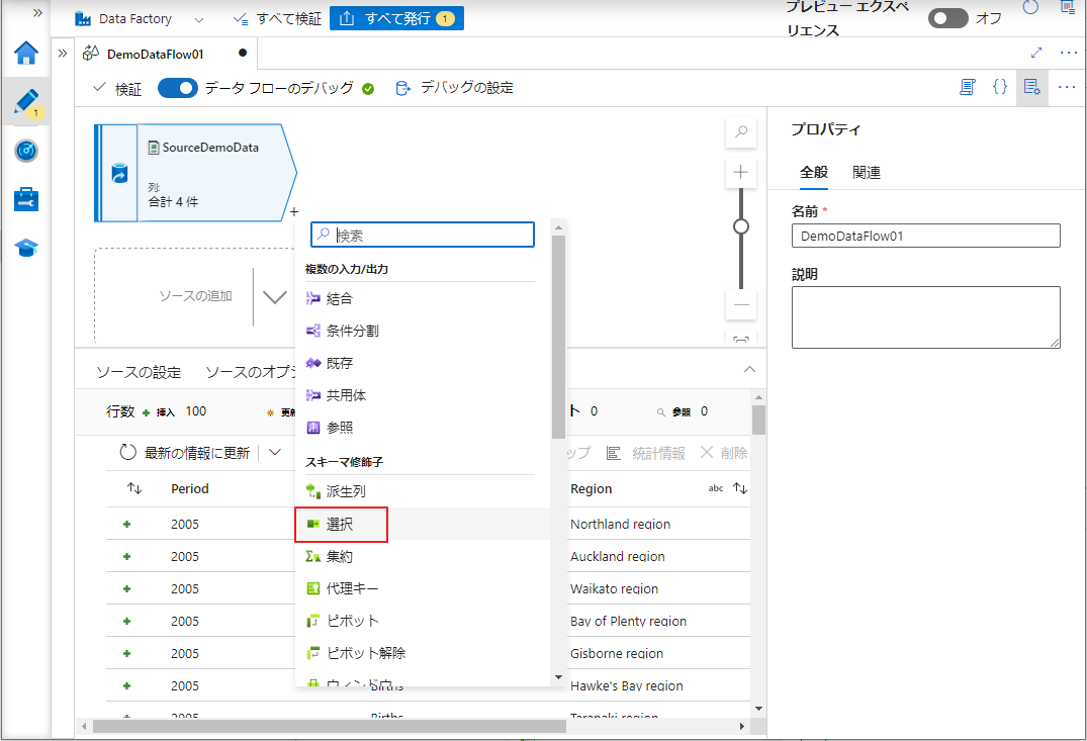 SQLのFROM文のように特定のテーブルからSELECTするには、ADFでソース変換を使用します。