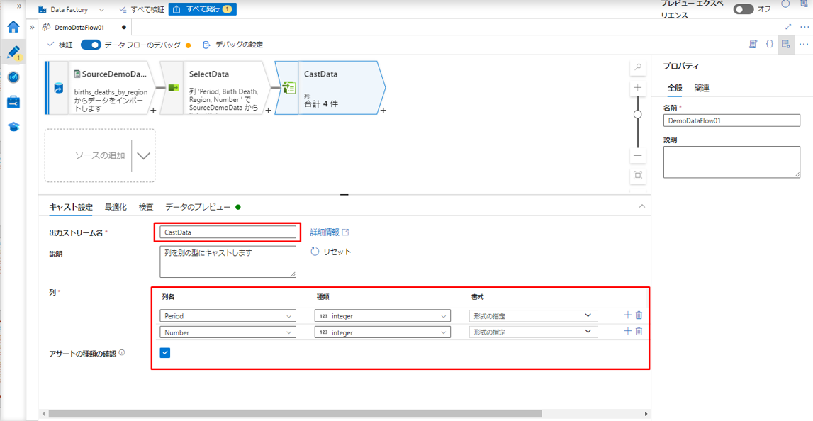 SQL の CAST のように各列のデータ型を変更するには、ADF でキャスト変換を使用します。