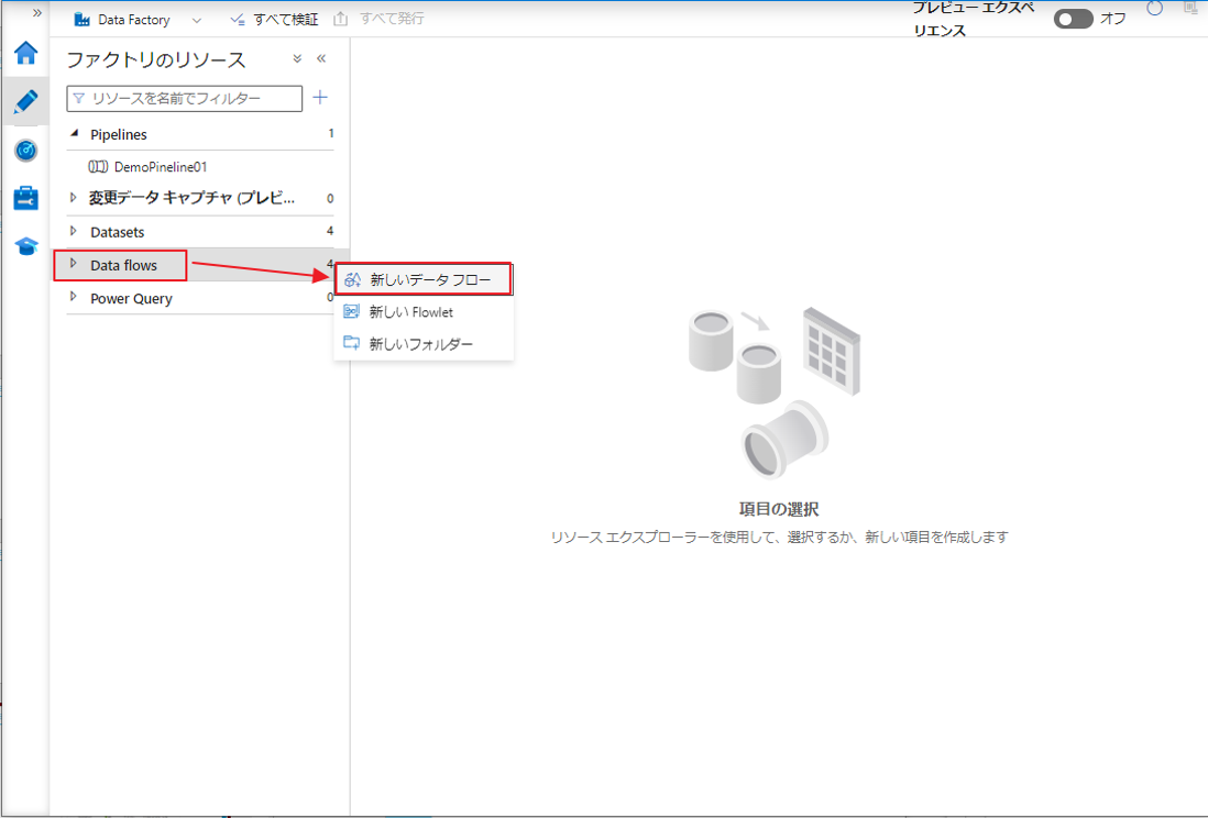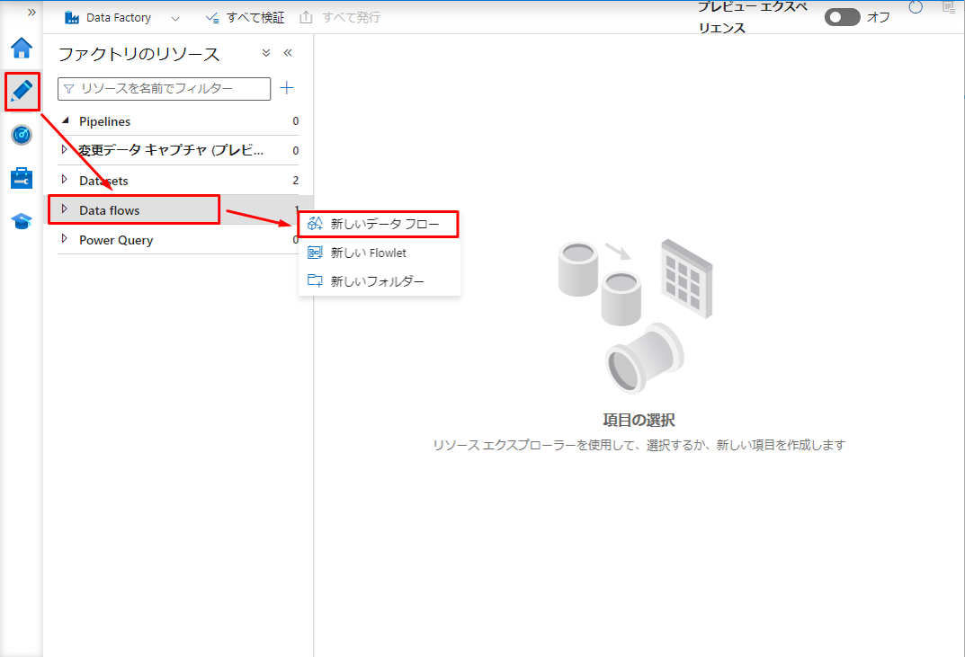 ① ADFのサイドバーで「Author」をクリックして、次に「Data flows」をクリックして、「新しいデータフロー」を選択します。