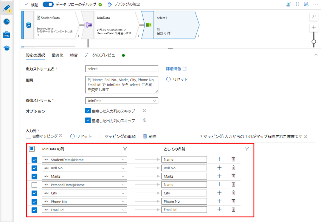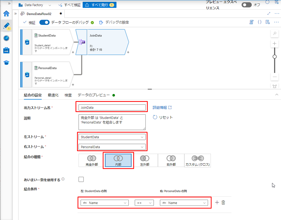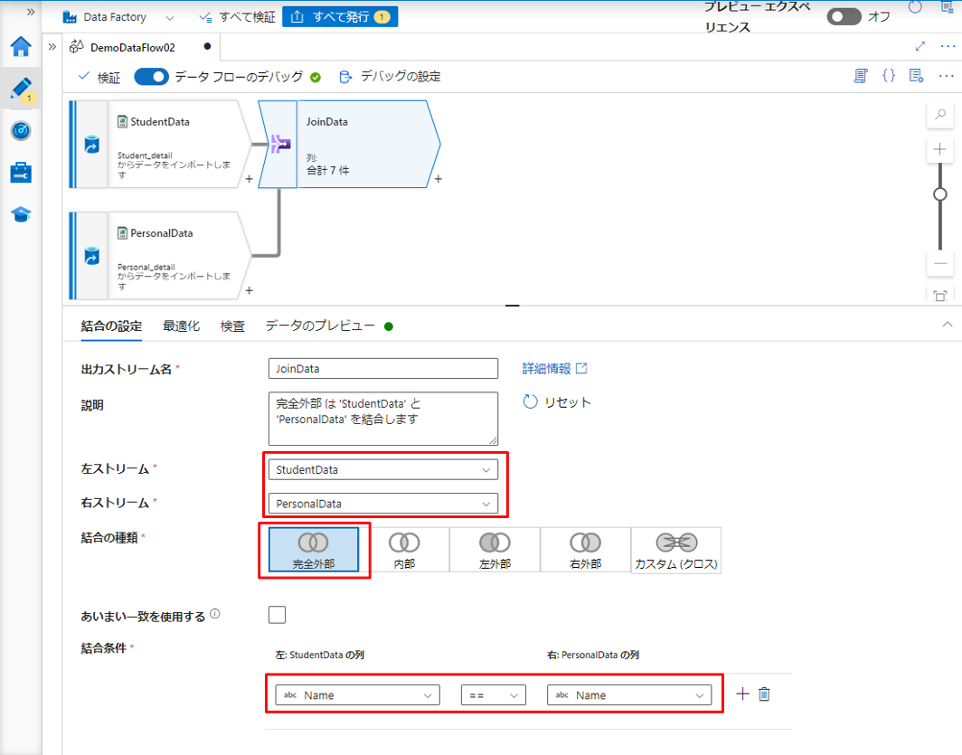 デバッグ モードを有効にする場合は、「データのプレビュー」タブで結合変換のデータをプレビューできます。
