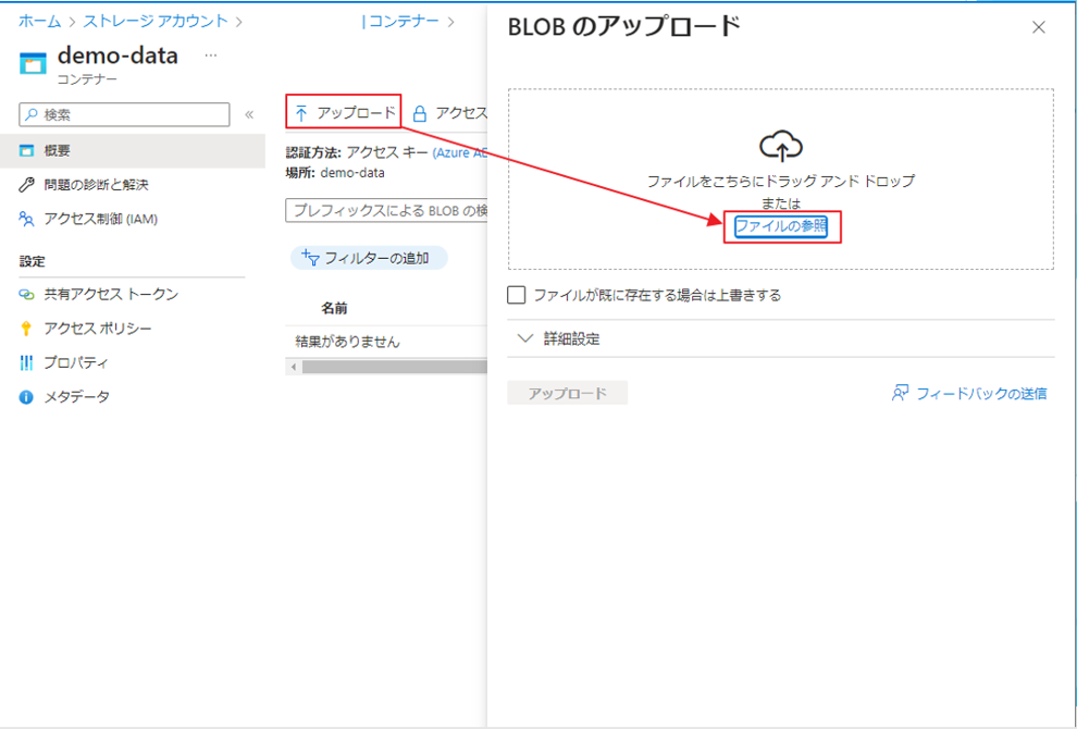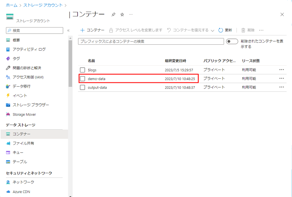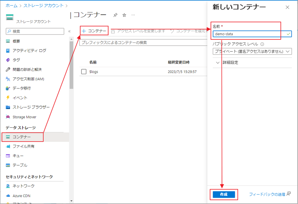 ① ストレージア カウントの画面でコンテナーを作成し、CSVファイルを格納します。