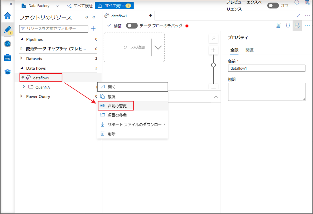 ②「名前の変更」をクリックしてデータフローの名前を変更します。