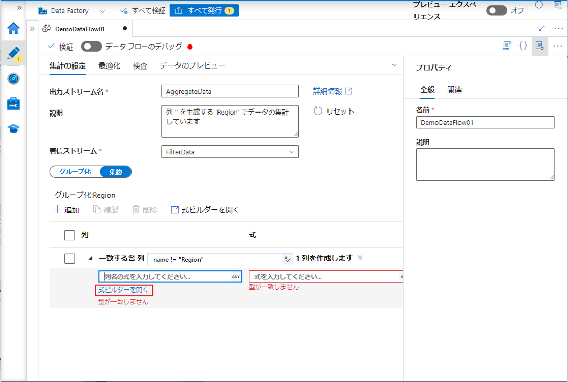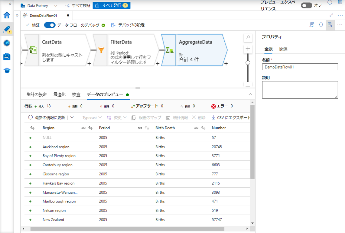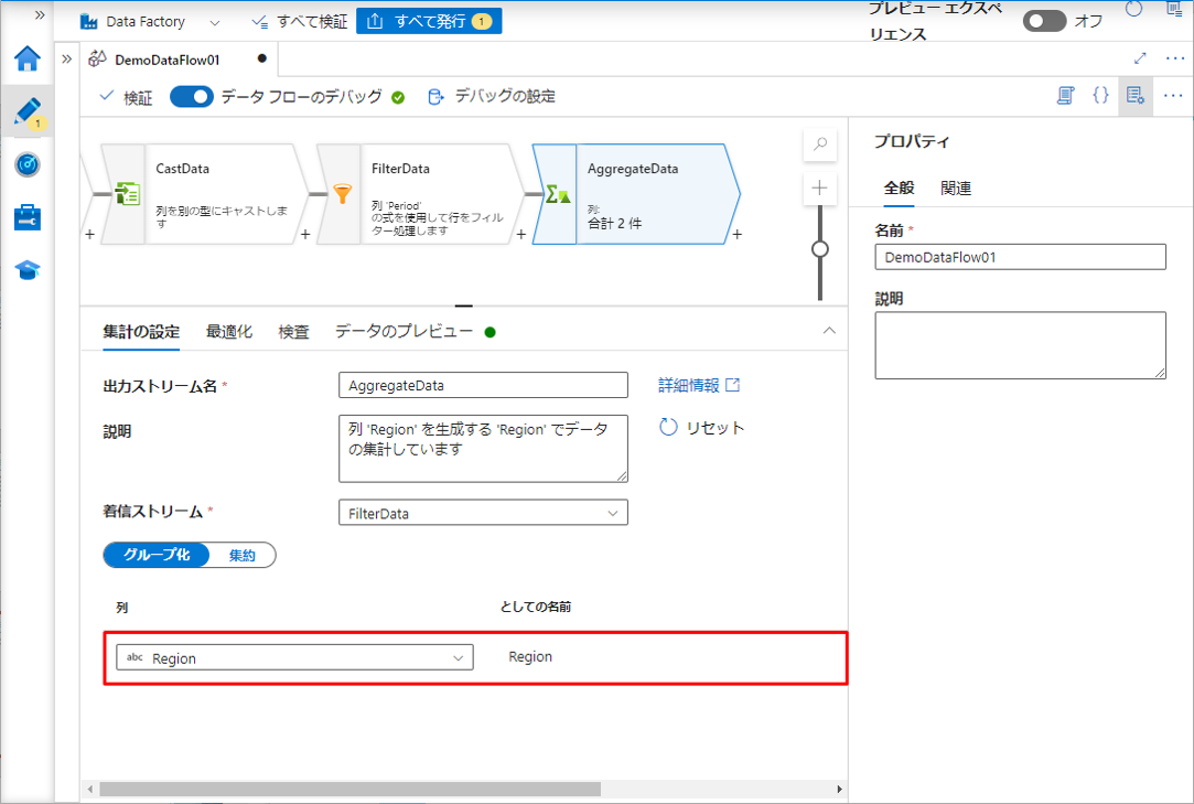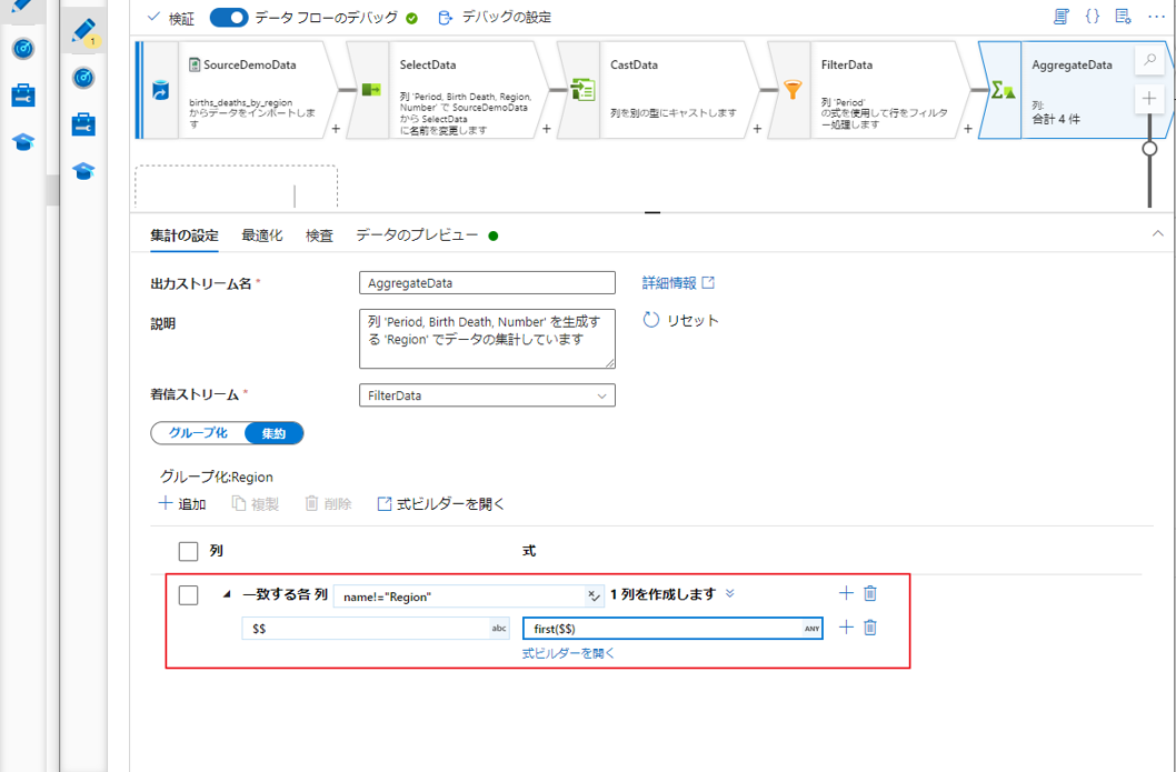 デバッグ モードを有効にする場合は、「データのプレビュー」タブで集計変換のデータをプレビューできます。