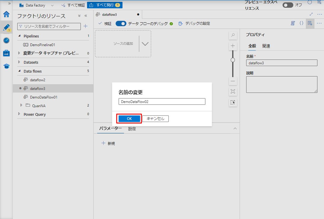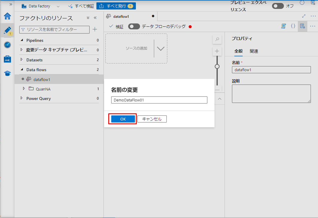 ③ データフローの名前を入力し、 「OK」ボタンをクリックします。