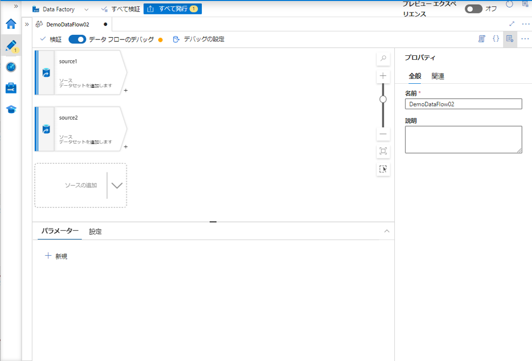 ④ データ フローの画面で「ソースの追加」をクリックし、2つのテーブルに対応する 2 セットのソース データを作成して、結合します。