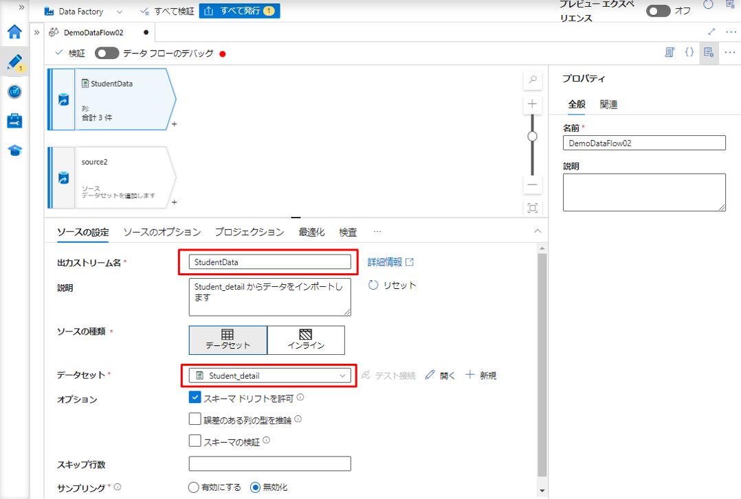 ⑤「ソースの設定」タブで、名前を変更して、データ セットを選択します。(画像に表しているのはStudent_detail テーブルです。)