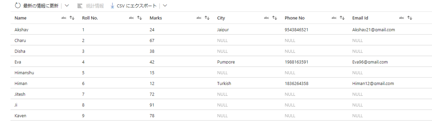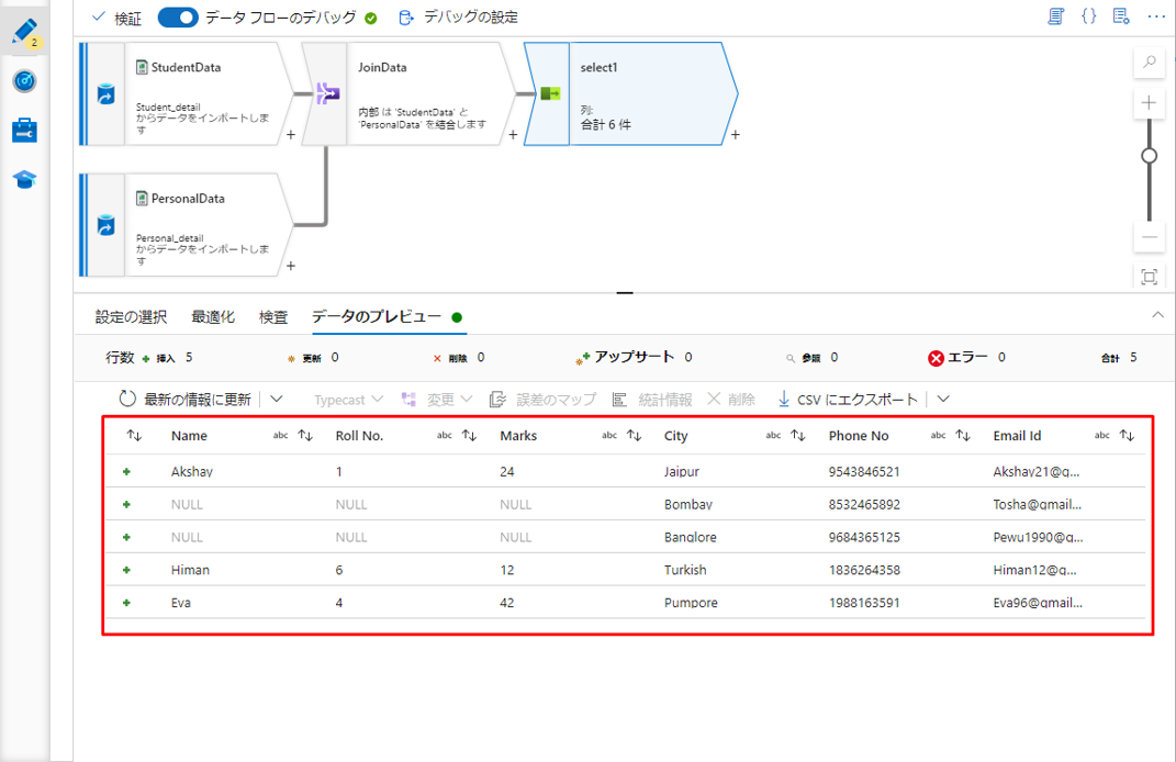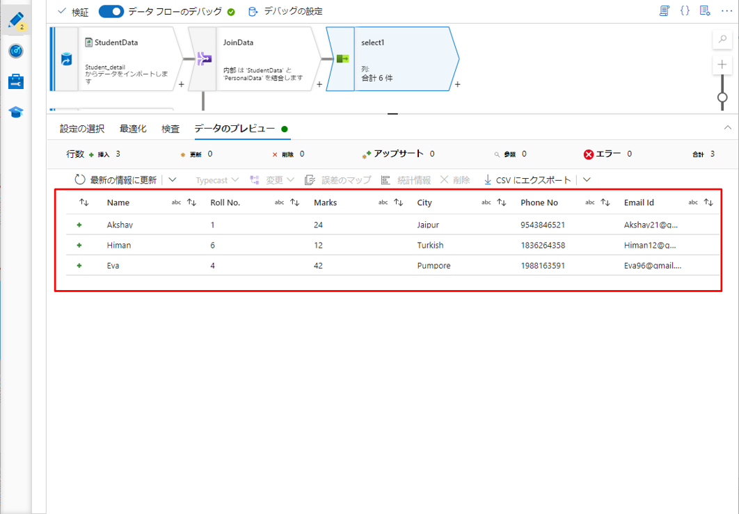 次に、データ フローのデバッグを有効にして、「データのプレビュー」タブをクリックして、CSV ファイルからインポートされたデータを確認します。