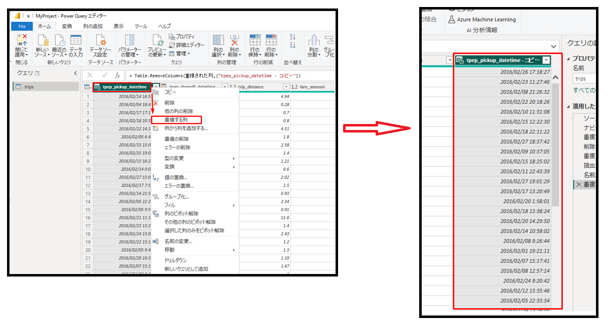 ②「tpep_pickup_datetime」を右クリックして、「重複する列」をクリックします。テーブルの一番右側に重複する列が作成されます。