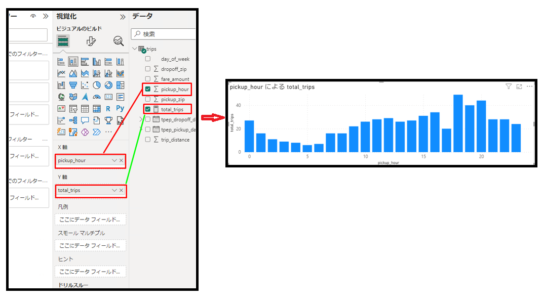 ⑦「pickup_hour」を「X 軸」に、「total_trips」を「Y 軸」にドラッグアンドドロップします。可視化は以下の画像通り表示されます。