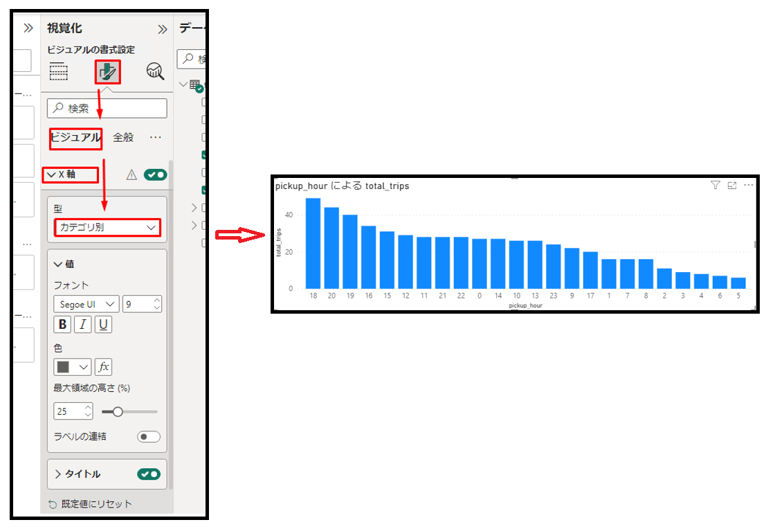 アイコンをクリックして「ビジュアル」タブで「X 軸」をクリックします。「型」項目で「カテゴリ別」を選択します。可視化は以下の画像通り表示されます。