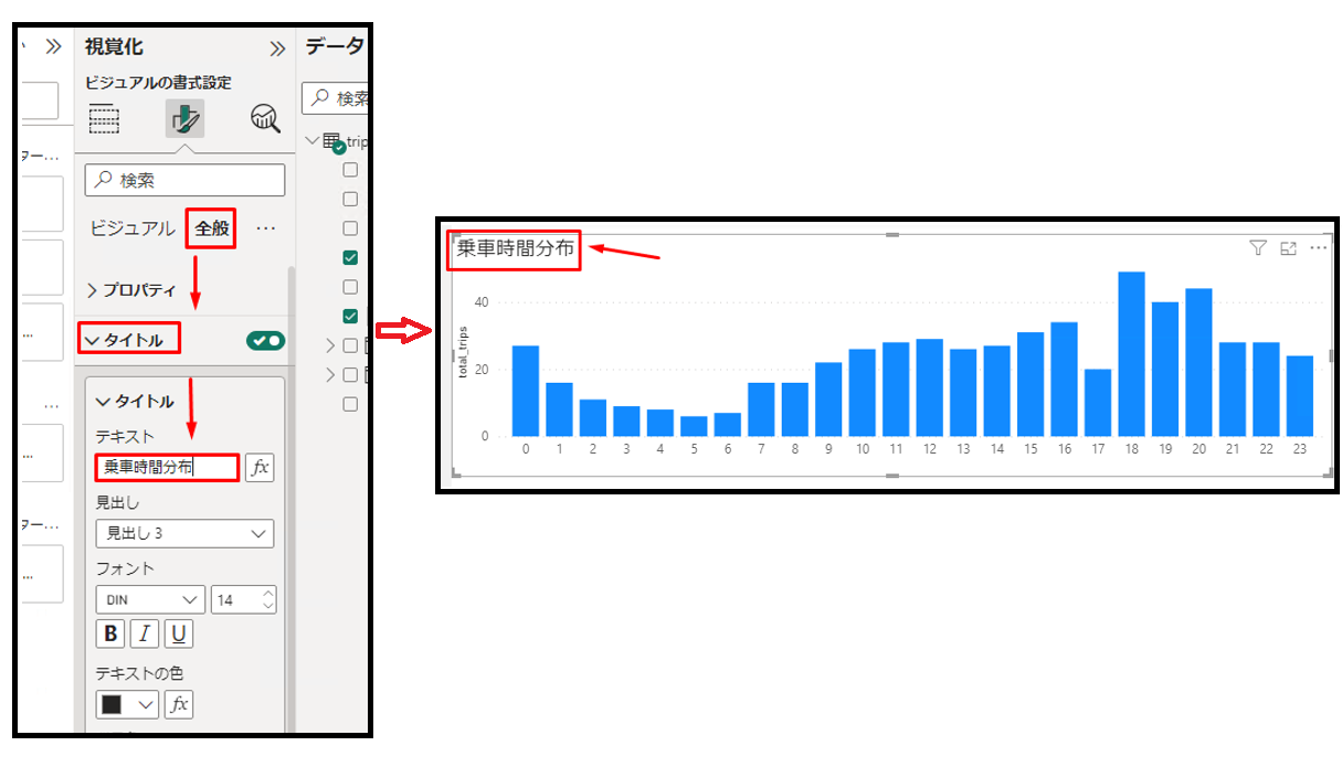 ⑩「全般」で「タイトル」を有効にします。 「乗車時間分布」を入力します。可視化は以下の画像通り表示されます。