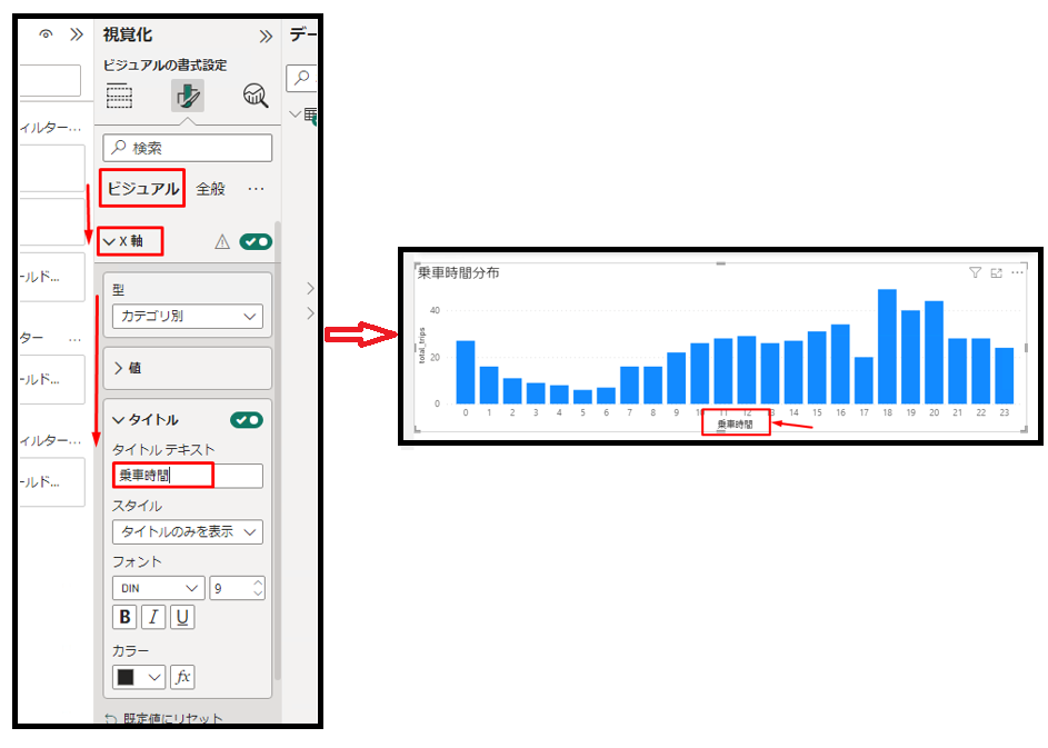 ⑪「ビジュアル」タブで「X 軸」を有効にして、「タイトルテキスト」項目で「乗車時間」を入力します。可視化は以下の画像通り表示されます。