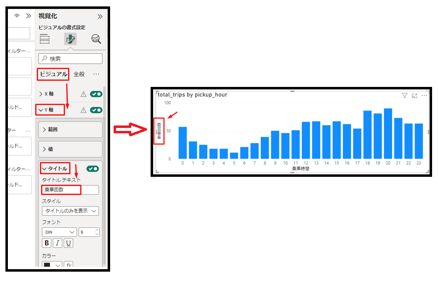 ⑫「ビジュアル」タブで「Y 軸」を有効にして、「タイトルテキスト」項目で「乗車回数」を入力します。可視化は以下の画像通り表示されます。