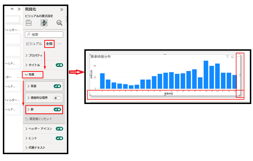 ⑬「全般」タブで「効果」をクリックして「影」を有効にします。可視化は以下の画像通り表示されます。