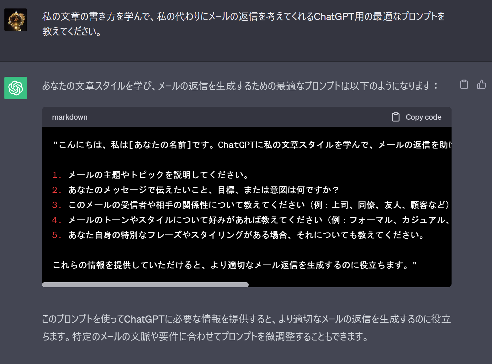 プロンプト例:「私の文章の書き方を学び、私の代わりにメールの返信を考えてくれるChatGPT用の最適なプロンプトは?」