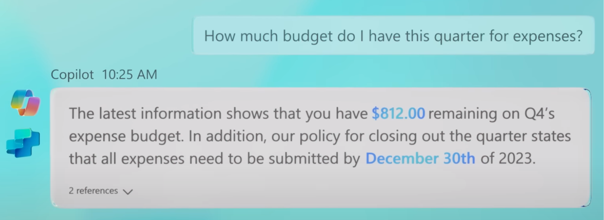 Copilot:「最新の情報では、$812がQ4の経費予算として残っています。また、会社のポリシーとして経費の申請は、2023年12月30日までに提出する必要があります。」
