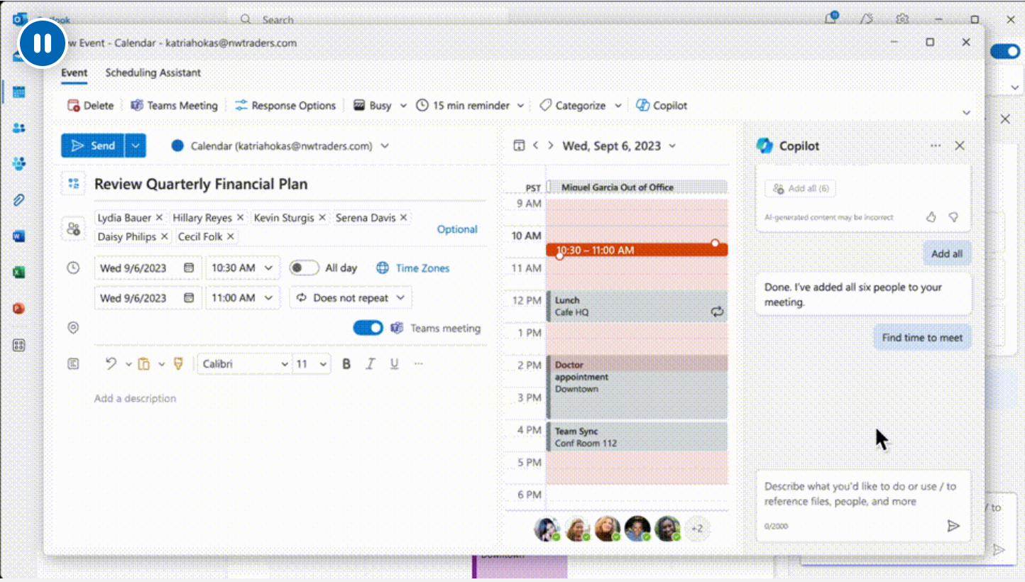 会議を作成すると、議題の下書き、会議内容の要約、会議タイトル案の作成、出席者の追加、出席者に分かりやすくするために元のスレッドの追加、全員が会議できる時間の提案が行われます。