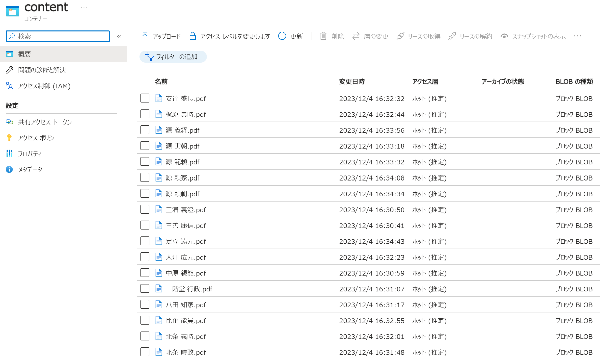 ①Blob StorageにPDFファイルを格納。各ファイルには歴史の人物に関する情報が記載されています。