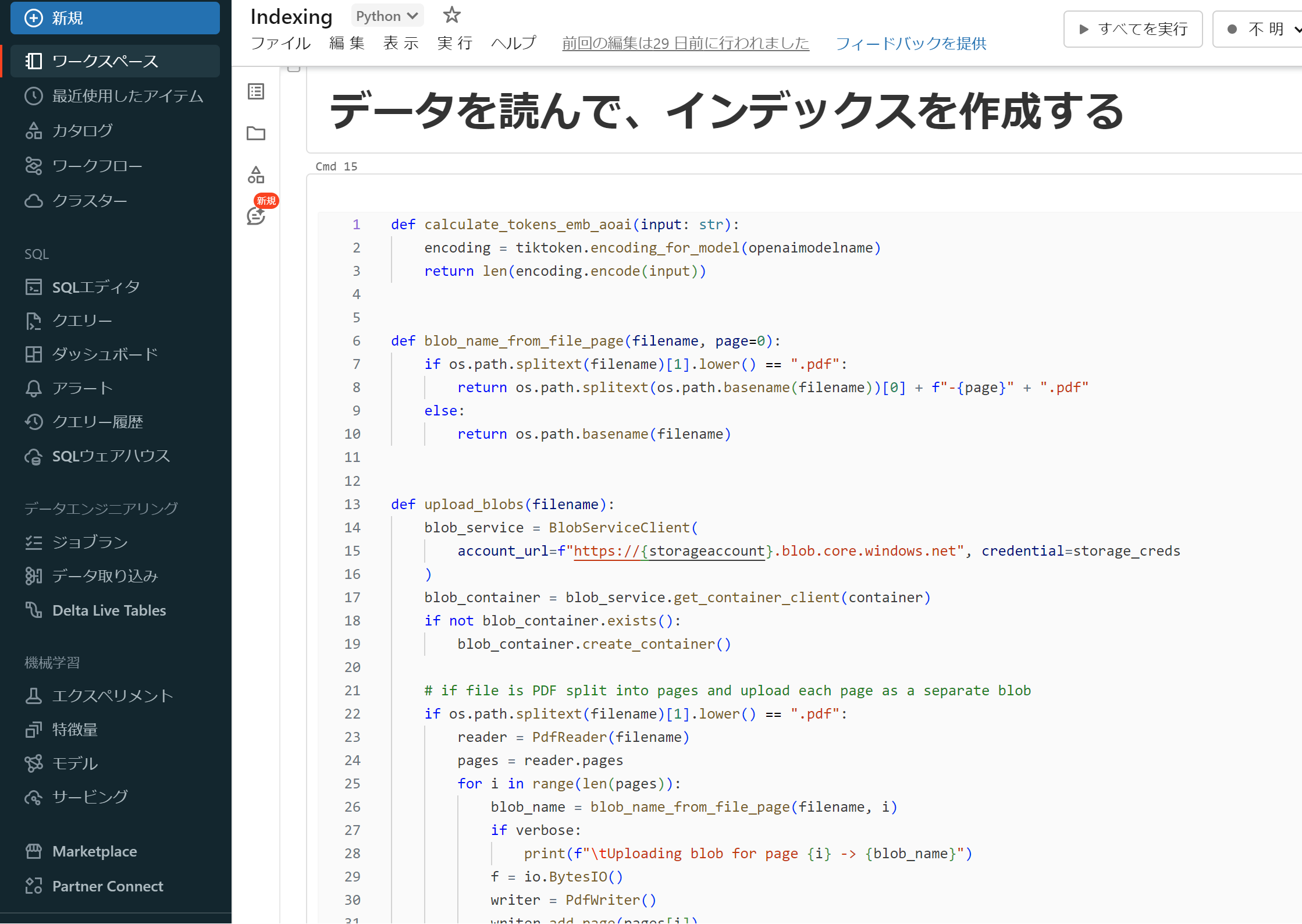 ③Azure Databricks のノートブックでPythonを使ってPDFファイルを1ページ毎に分割し、Form Recognizer を使って1ページの文章からチャンクを生成します。その後、生成したチャンクをAzure Open AI の Embedding Modelを使ってベクトル化します。