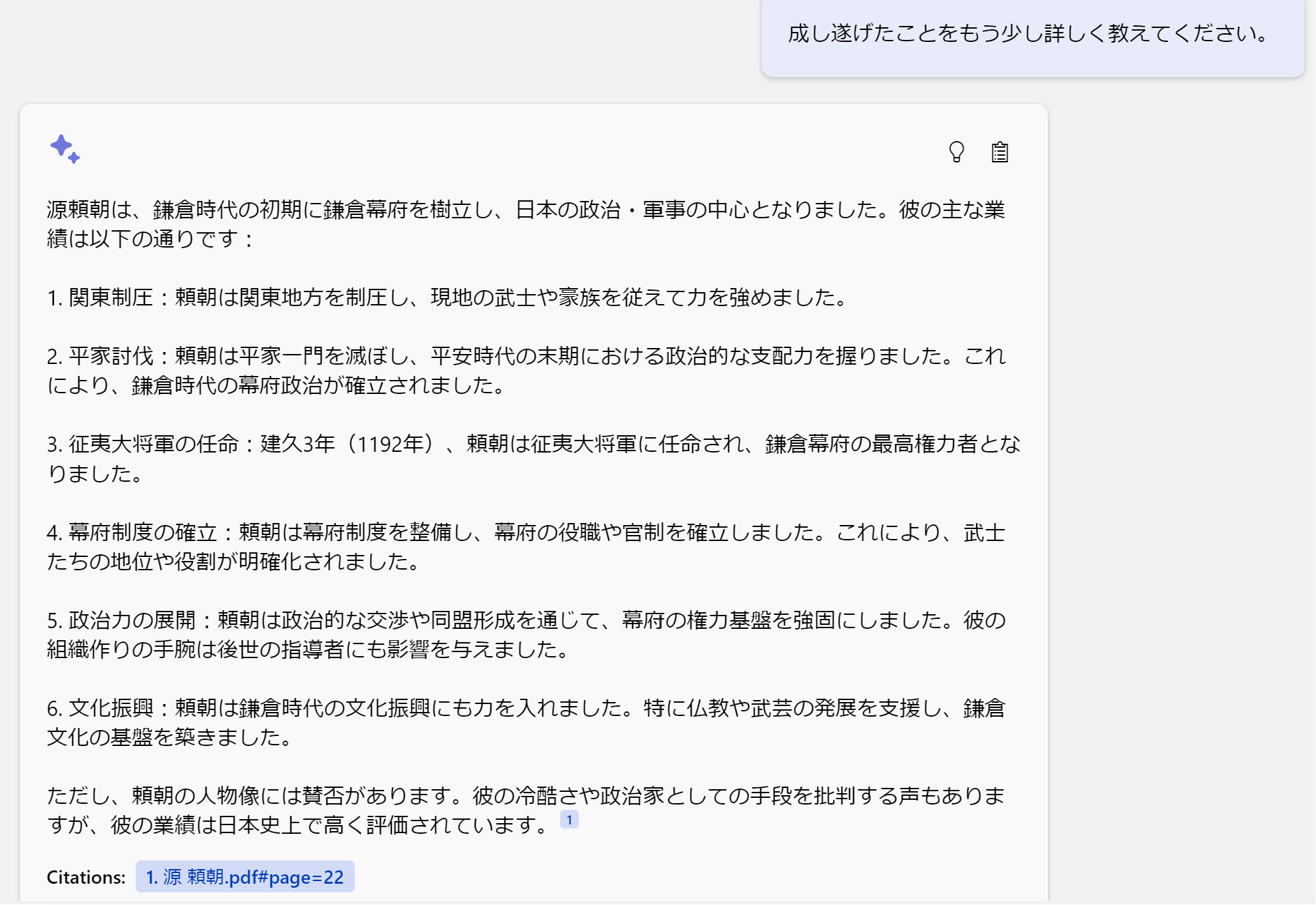 「源 頼朝が成し遂げたこと」という文章の意味を理解して、数十ページにおよぶPDFから正確に回答されています。