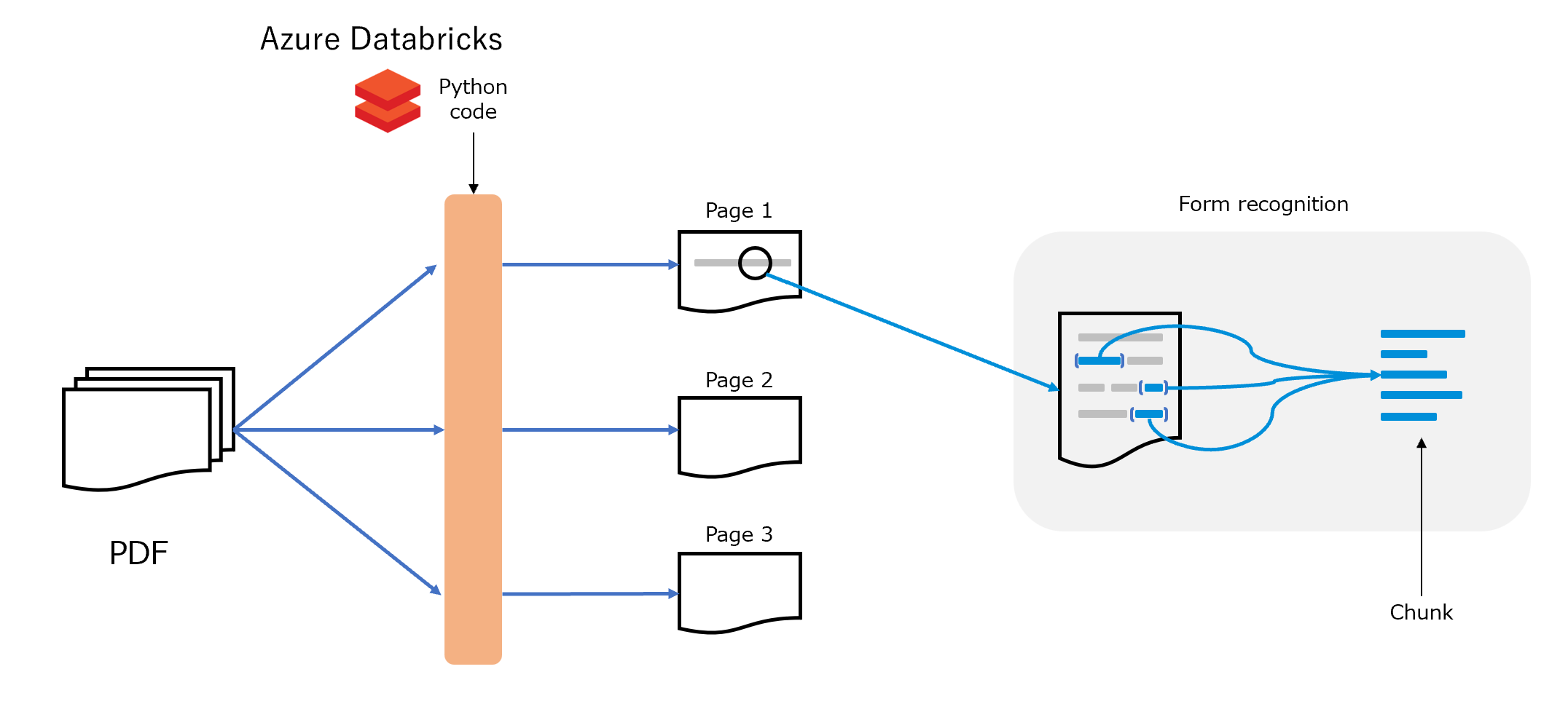 今回のデモンストレーションでは、Blobストレージに保存されたPDFファイルをAzure Databrick を使ってページ単位に分割します。その後Azure Open AI の Form Recognizer を使ってチャンク分割します。