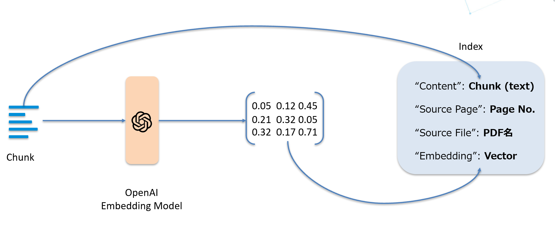 チャンクをOpen AI の Embedding Model でベクトル化し、Cognitive Search でインデックス化することで、社内ChatGPTシステムから検索できるよう構成します。