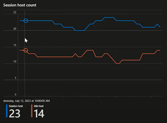 可視化できる分析情報として、前半にも記載しましたが、「セッションホスト数」があります。このセッションホスト数ですが、単純な数だけでなく、操作せずにそのまま立ち去ってしまったようなインアクティブ(正式な用語としては「アイドル状態」)のホスト数も算出することができます。