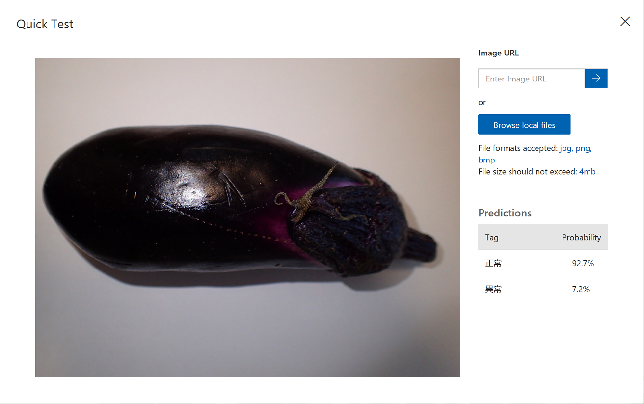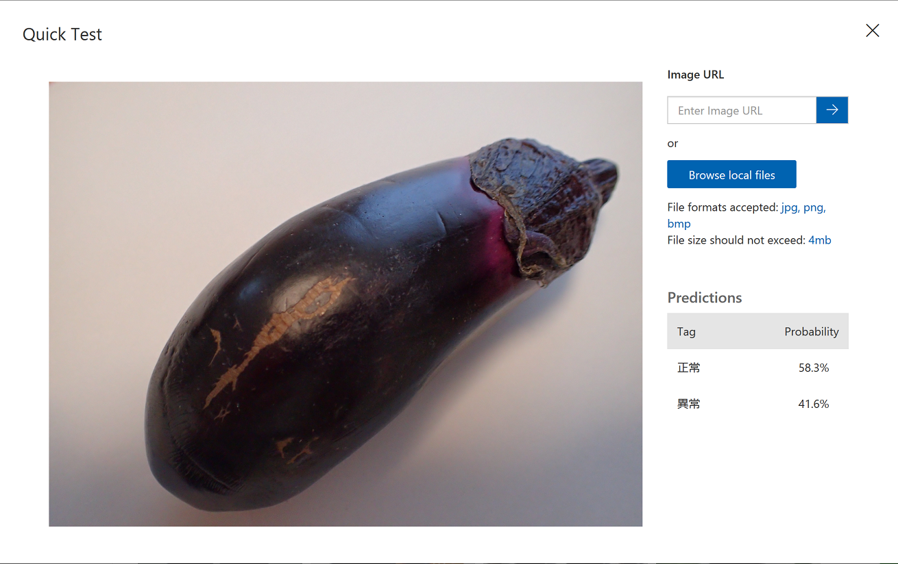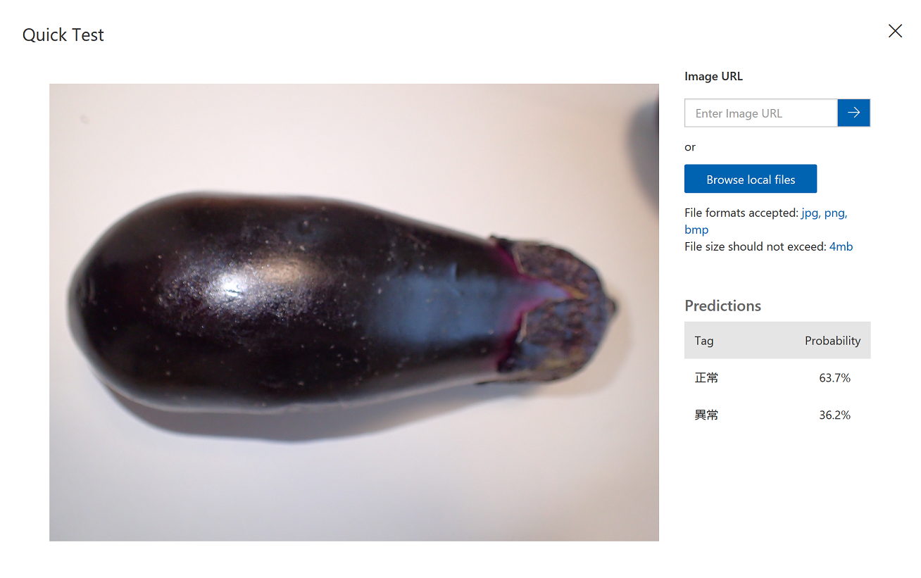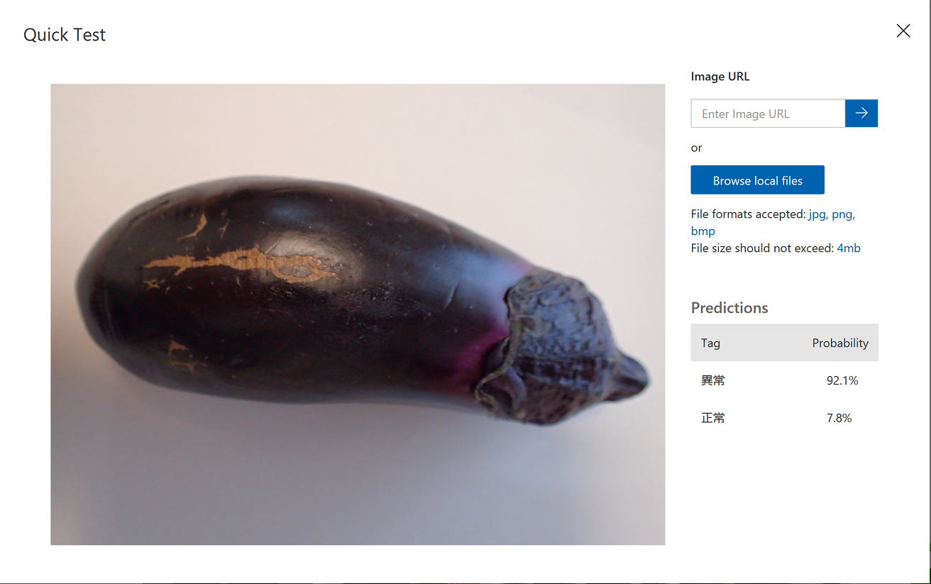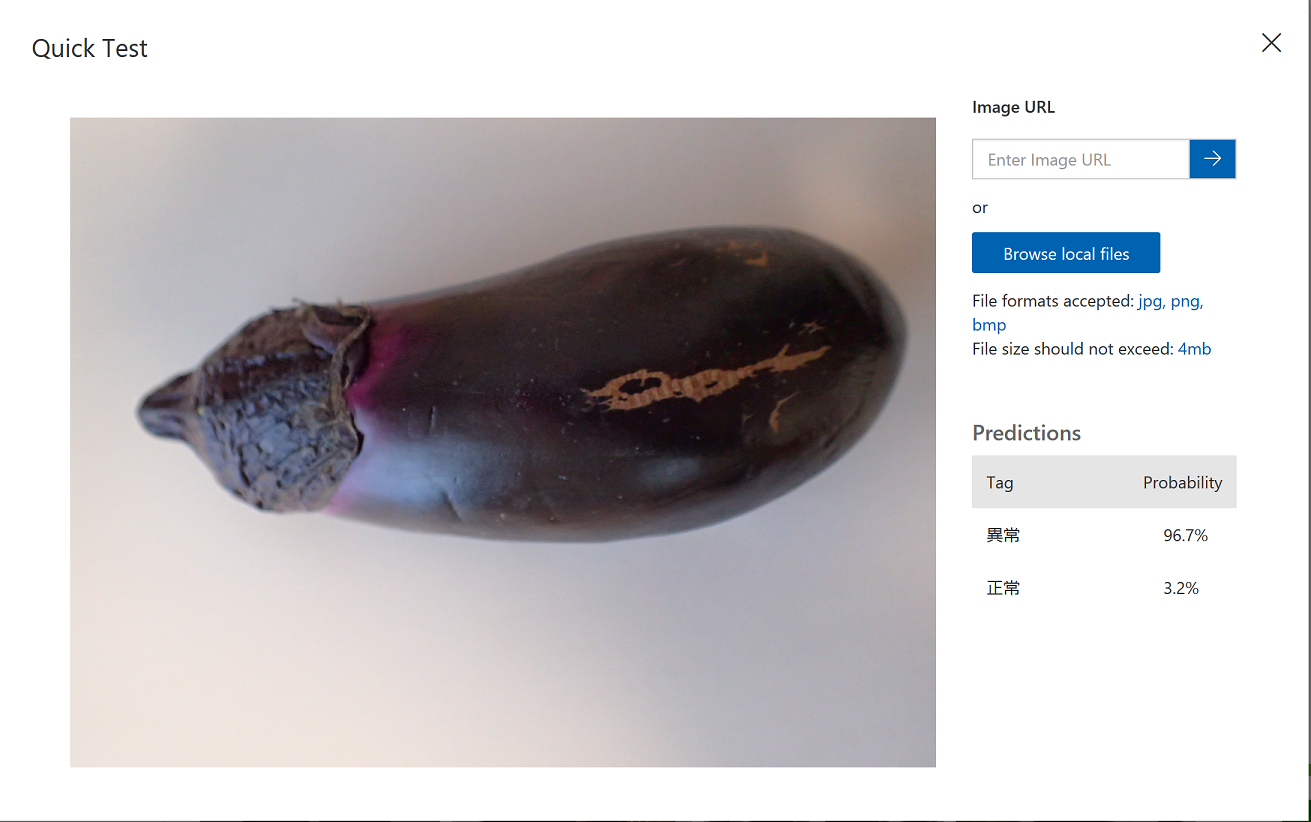 トレーニングした学習モデルへ、評価用に調達したナスの画像をアップロードします。Bing Image Search v7 APIで収集した画像をもとにトレーニングを行った画像分析器は、最後の一枚をのぞき、傷ありのナスを正しく判定しました。
