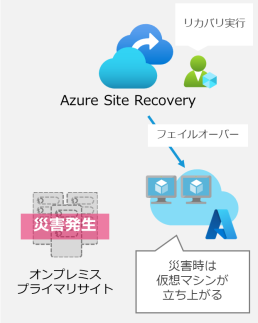 災害発生時は、セカンダリサイトであるAzureへフェイルオーバーし、仮想マシンを立ち上げることでAzure上で事業継続が可能となります。