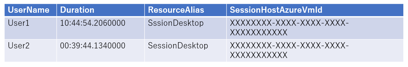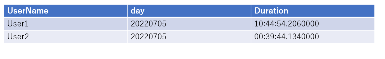 出力イメージの「UserName」列はAzure ADのユーザー名、「day」列は日時情報、「Duration」列はAVDへの接続時間です。